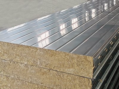 不銹鋼巖棉夾芯板其上下表面采用一面不銹鋼板一面彩鋼板或雙面不銹鋼板,厚度為0.4-0.8mm。通過自動(dòng)化連續(xù)成型機(jī),經(jīng)壓型后用高強(qiáng)粘合劑粘合而成。巖棉塊交錯(cuò)鋪設(shè),其纖維走向垂直于不銹鋼巖棉夾芯板的上下表面,并緊密相接充實(shí)了不銹鋼夾芯板的整個(gè)縱橫截面。巖棉塊之間和巖棉與上、下層鋼板之間通過高強(qiáng)度發(fā)泡劑粘接復(fù)合而成。不銹鋼巖棉夾芯板板有很強(qiáng)的剛度,具有防火、保溫、隔音等性能。